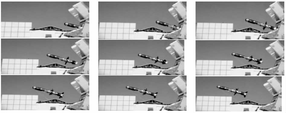 ? ? ? ?用于武器系統(tǒng)的發(fā)射、飛行、攻擊過程記錄和參數(shù)測(cè)試。圖為PhantomV5.0系統(tǒng)獲得的導(dǎo)彈發(fā)射序列圖像(攝像機(jī)視場(chǎng)固定),SVRⅡ攝像系統(tǒng)獲得彈丸脫殼圖像,攝像機(jī)放置在跟蹤架上跟蹤炮彈的飛行過程。